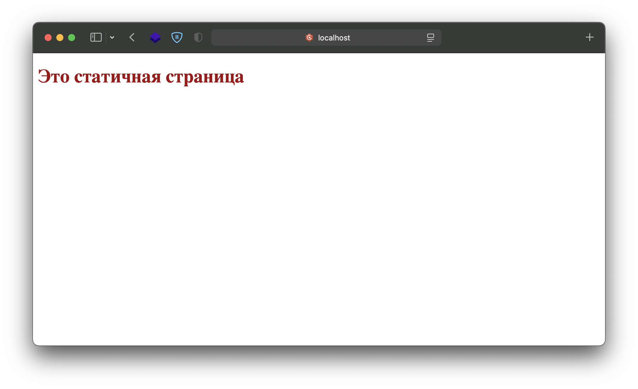 Откройте в браузере адрес http://localhost:3000/example.html. Вы должны увидеть созданную нами HTML-страницу с большим красным заголовком.